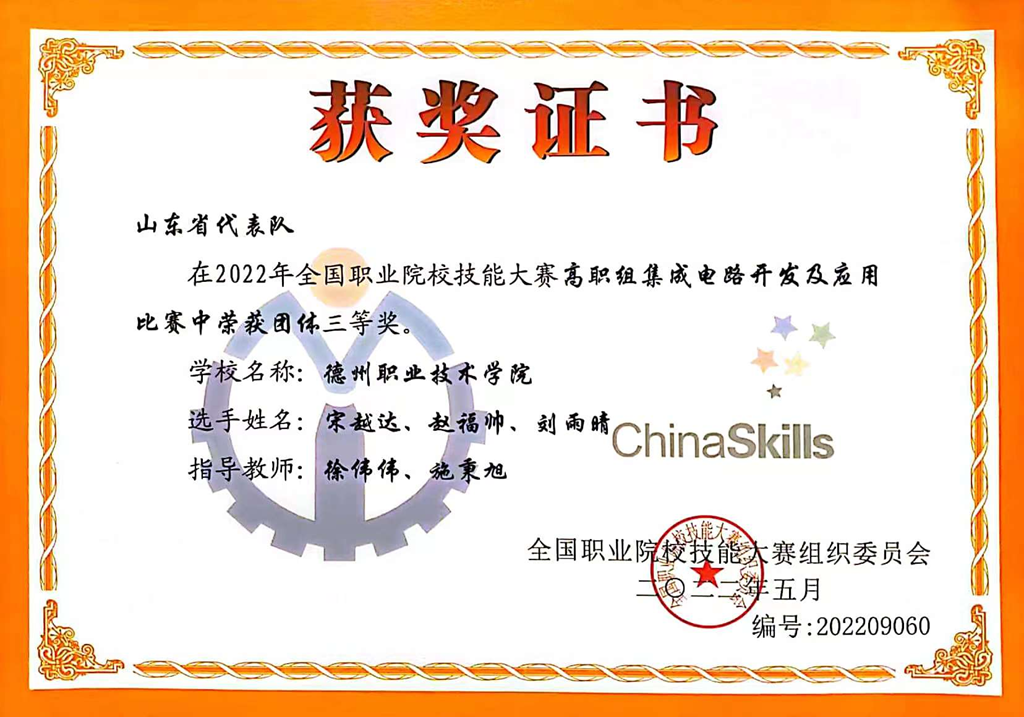 2022年全国职业院校技能大赛高职组“集成电路开发及应用”赛项,于8月31日在滨州职业学院落下帷幕,金年会电子与新能源技术工程系参赛队员宋越达、赵福帅、刘雨晴在指导教师徐伟伟、施秉旭、李修丞的指导下荣获三等奖,实现了本赛项在国赛奖牌中零的突破。